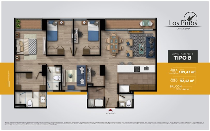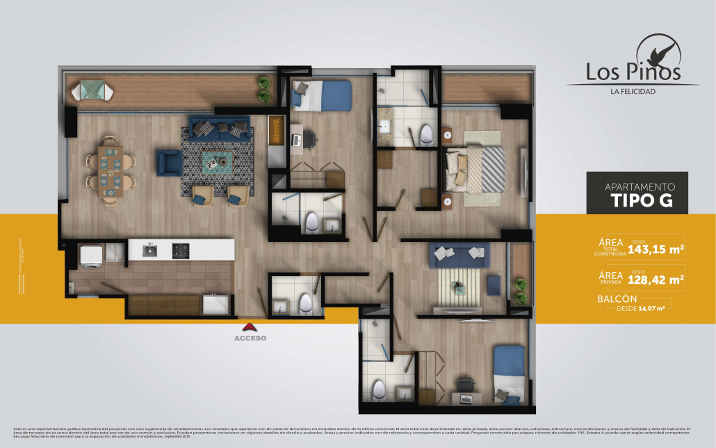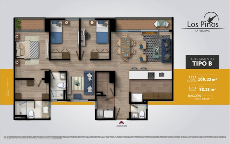Las ilustraciones gráficas del proyecto contienen una sugerencia de amoblamiento. Los muebles que aparecen son de carácter decorativo no incluidos dentro de la oferta comercial. El paisajismo de los predios vecinos al proyecto, que se aprecia en todas las piezas publicitarias, solo son una representación artística y no compromete a CONSTRUCTORA COLPATRIA S.A.S., dado que no son predios vinculados al proyecto en venta. El área total está discriminada en: área privada, área común (ductos, columnas, estructura, muros divisorios y muros de fachada) y área de balcones cuando aplica. El precio del inmueble podrá tener variaciones antes de la separación del inmueble, dependiendo de las condiciones de mercado y disponibilidad de unidades.